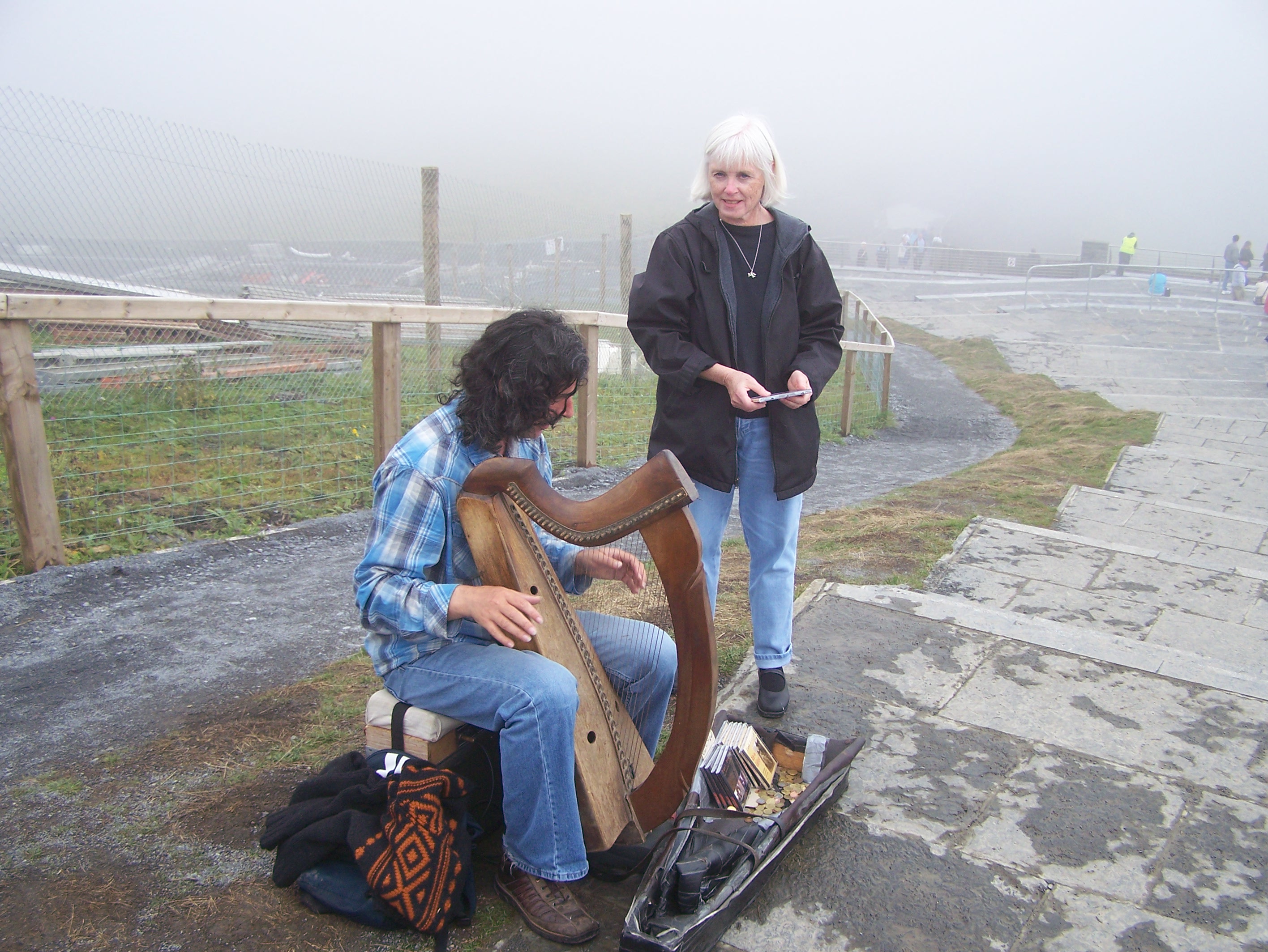 There was a lone harper on the steps and so Noël stopped to listen and bought one of his CDs while I took her picture with him. This guy was ideally equipped for this gig. He was sitting on a little wooden box. He had taped a piece of foam rubber to the top of it to make himself a seat. The box contained his amplifier and it had wires leading from the back of box to his harp. There was also an electrical plug hanging out the back that was probably used to recharge the battery that ran the whole operation, otherwise he would have needed an extension cord about a ½ mile long. The harp was small, steel strung, and pretty much the worse for wear – a perfect choice for wet, cold days – what else could happen to it. His case tripled as a harp case, a place to toss coins and a place to display the CDs he had for sale. Even here there seemed to be a plan at work. He would only put out a few CDs, so that potential customers would think there were only a few left. This would hopefully create an impulse to buy one before they were all gone. However, after a few were purchased they would be replaced from a stash he had inside the box. He had a very nice little operation.
