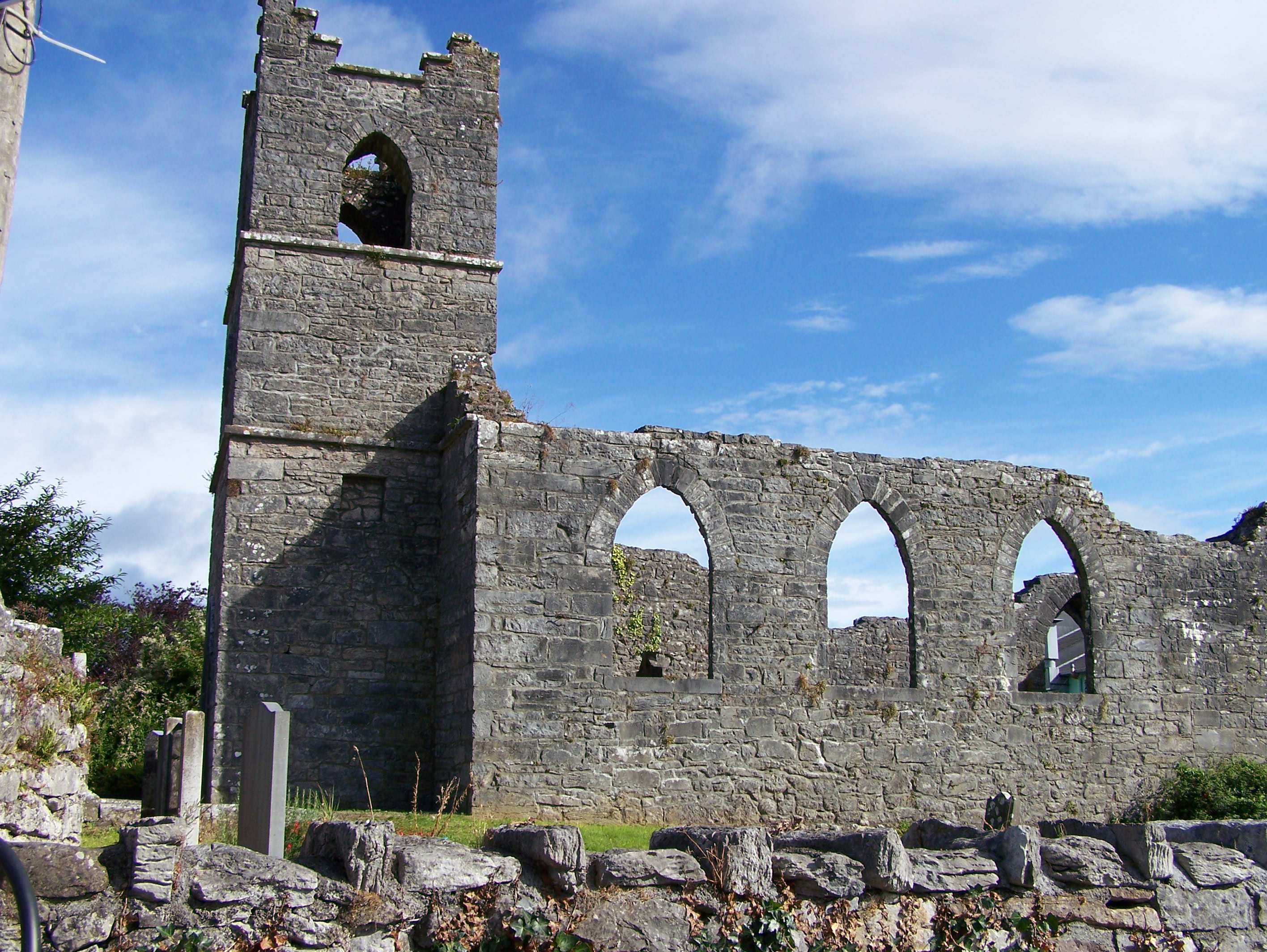 After taking a few photos we left Athenry Castle and walked to an old church just down the road that was in ruins and had and attached graveyard. There were many old gravestones all around the structure plus some inside the ruins as was the custom during the penal times of the 18th century. There were some modern stones that indicated that the graveyard was still in use. It was starting to rain as I snapped a few pictures and then we went back to the car and headed toward Killaloe via Feakle and Scarriff.