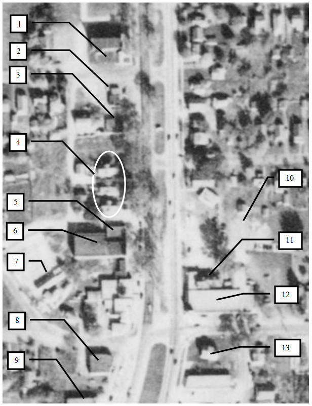 The labeling of the Kirsch houses on Brewerton Road, as shown in the aerial photo above, have been selected in anticipation of the house that was subsequently built between the two shown here. In the 1930 census the occupancy was, starting from the north: (1) Leo Kirsch, (2) Henry Kirsch, and (3) Emmanuel Kirsch. In 1925 only Leo and Emmanuel were living on Brewerton Road, Henry was living in the 1st Ward.