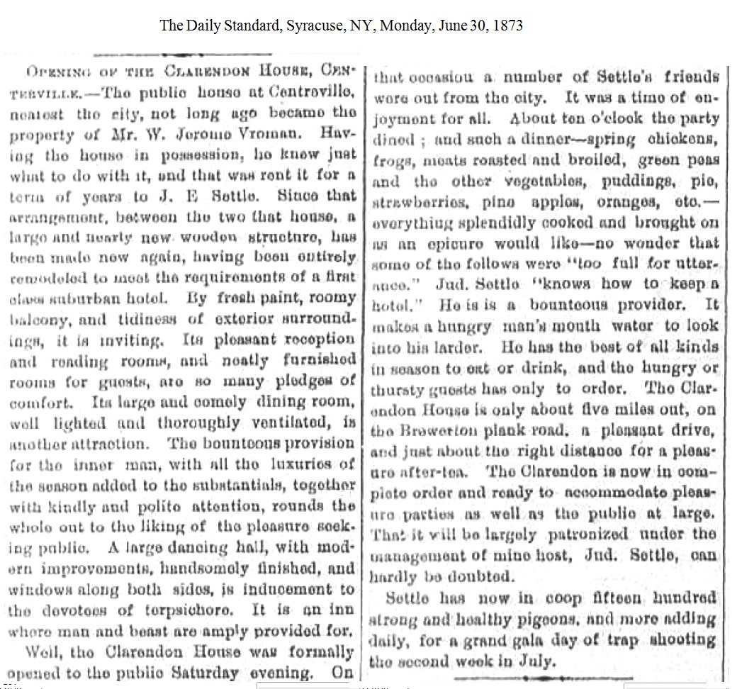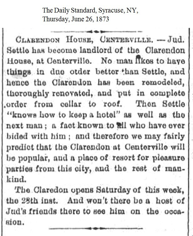 The newly remodeled hotel opened on June 28, 1873, with Jud Settle as the new landlord. The Clarendon House was located about five miles out of the city of Syracuse, on the Cicero Plank Road [1873-06-26].