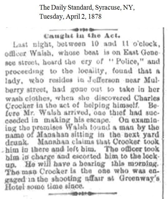 Charles Crocker – Proprietor of the Clarendon House in 1875; In June 1877 Crocker was the bartender at the Greenway’s (Watering Trough) when the riot broke out. In 1878 (April 2) Crocker was caught in the backyard of a woman at Jefferson near Mulberry, with a drunken associate, stealing her clothes that were hung out to dry. When the police officer arrived Crocker jumped a fence and got away while the officer scooped up his friend who was too drunk to escape. [1878-04-02]