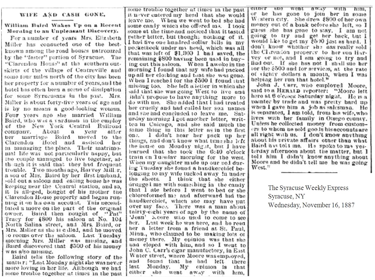 The main purpose of the article that furnished this less than pleasant description of Mrs. Miller, and the place that she had run for about 5 years, was the story of Mrs. Miller leaving her 2nd husband. A few months earlier, Mrs. Miller's son by her first husband, Harvey Miller, had bought the Clarendon House from his mother and was running it for himself. Mrs. Miller and her husband, William Baird, left Clarendon House and moved in above "Pat" Tracy's saloon at 104 North Salina street. Baird had purchased the place from Tracy. One night Elizabeth drugged her husband and took $500 from his pants, cleaned $800 out of her personal bank account and headed west with an old boy friend. Braid said, "I am not going to try and get her back, but I would like to get my $500.." [1887-11-16]
