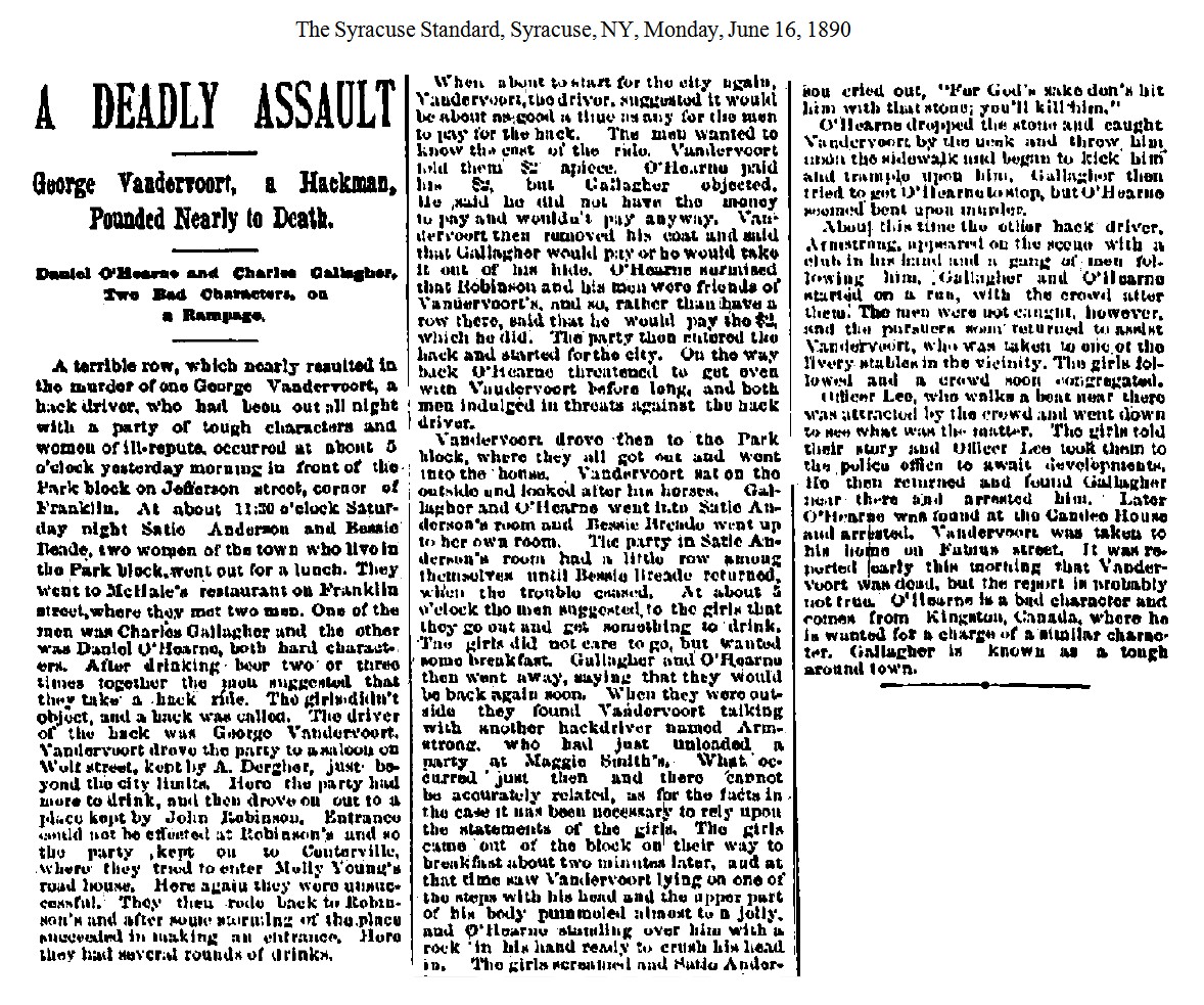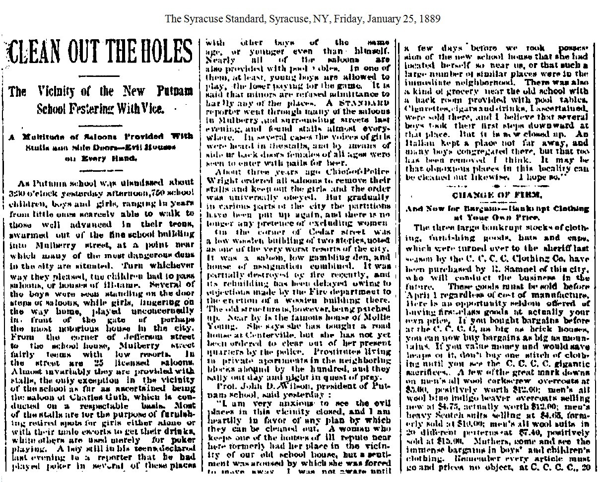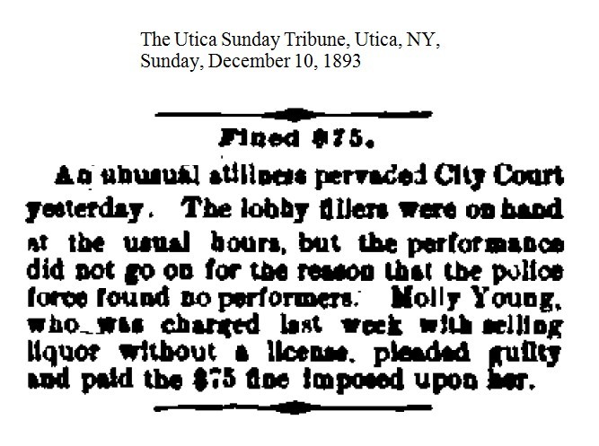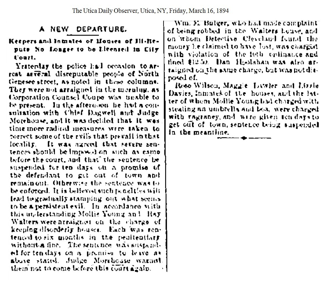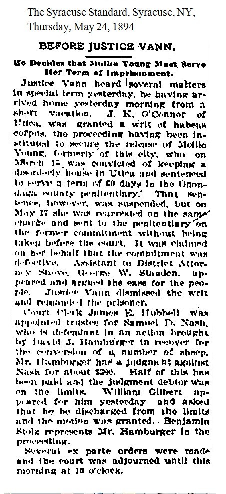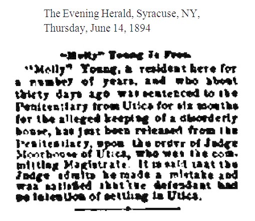 Mollie Young – Mollie was a prostitute in Syracuse and later ran the Clarendon House for a while, until it burned down in 1890. By 1893 she was in Utica, NY, paying a fine of $75 for selling liquor without a license. [1893-12-10] In March 1894 Molly was arrested in Utica for "keeping a disorderly house." She was given a sentence of 60 days with the sentence suspended for 10 days with the promise that she would "get out of town and remain out." [1894-03-16] Several days later she was arrested on the same charge and sent off to the Onondaga County Penitentiary without an appearance in court. J. K. O'Connor appeared before Justice Vann in Syracuse with a writ of habeas corpus to get Mollie's release. Vann tossed the writ and ordered that Young complete her sentence. [1894-05-24] The following month the judge who had originally sentenced Mollie ordered that she be released. "It is said that the Judge admits he made a mistake and was satisfied that the defendant had no intention of settling in Utica." [1894-06-14] And with that Mollie Young disappeared.