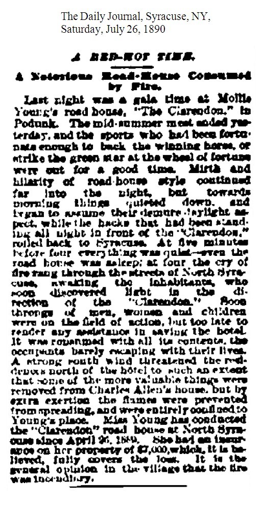 NOTES: [1873-06-26] - "Clarendon House, Centerville," The Daily Standard, Syracuse, NY, Thursday, June 26, 1873. [1873-06-30] - "Opening Of The Clarendon House," The Daily Standard, Syracuse, NY, Monday, June 30, 1873. [1873-07-17] - "Trap Shooting at Centerville," The Syracuse Daily Journal, Syracuse, NY, Thursday, July 17, 1873. [1875-12-19] - "The Root Of All Evil - A Wanton Attempt to Murder an Heir," The Standard Courier, Sunday, December 19, 1875. [1878-04-02] - "Caught in the Act," The Daily Standard, Syracuse, NY, Tuesday, April 2, 1878. [1887-11-16] - "Wife And Cash Gone," The Syracuse Weekly Express, Syracuse, NY, Wednesday, November 16, 1887. [1889-01-25] - "Clean Out The Holes," The Syracuse Standard, Syracuse, NY, Friday, 25, 1889. [1890-06-16] “A Deadly Assault, George Vandervoort, a Hackman, Pounded Nearly to Death, Daniel O’Hearne and Charles Gallagher, Two Bad Characters on a Rampage,” The Syracuse Standard, Syracuse, NY, Monday, June 16, 1890. [1890-07-26] - "A Red-Hot Time. A Notorious Road-House Consumed by Fire," The Daily Journal, Syracuse, NY, Saturday, July 26, 1890. [1890-07-28] - "A Road House Burned Up," The Syracuse Courier, Syracuse, NY, Monday, July 28, 1890. [1893-12-10] - "Fined $75.", The Utica Sunday Tribune, Utica, NY, Sunday, December 10, 1893. [1894-03-16] - "A New Departure, Keepers and Inmates of Houses of Ill-Repute No Longer to be Licensed in City Court," The Utica Daily Observer, Utica, NY, Friday, March 16, 1894. [1894-05-24] - "Before Justice Vann," The Syracuse Standard, Syracuse, NY, Thursday, May 24, 1894. [1894-06-14] - " 'Molly' Is Free, " The Evening Herald, Syracuse, NY, Thursday, June 14, 1894.
