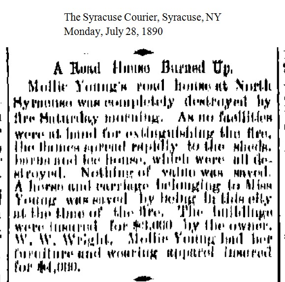 Mollie began her business career in the city of Syracuse running a house of prostitution on Mulberry Street. She received the following piece of publicity about her Syracuse business, shortly after she had leased the Clarendon House from W. W. Wright. "Nearby is the infamous house of Mollie Young. She says she has bought a road house at Centerville, but she has not yet been ordered to clear out of her present quarters by the police."[1889-01-25]