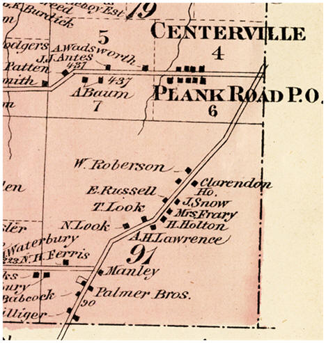 1874 – The Clarendon House was on the east side of the Cicero Plank Road, just south of Centerville (now North Syracuse). To the south of the Clarendon House was the house owned by Manley, on Lot 91, where the Liverpool Road ends at the Cicero Plank Road. In 1890, this property was owned by Frank Chrysler who sold it to Henry King. Chrysler's house was made into Maud Wilson's roadhouse.