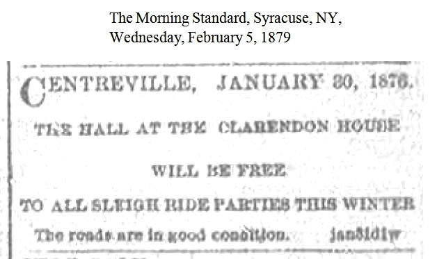 An Attempted Murder Prevented at the Clarendon House On the afternoon of December 16, 1875 a sleigh carrying four men pulled up to the Clarendon House on the Cicero Plank Road, just south of the village of Centerville. After leaving the sleigh in the adjoining shed, two of the men were about to enter the hotel when the proprietor, Charles Crocker, suggested that their other two friends, who appeared to be drunk, might freeze if they were left out in the shed with the sleigh. Initially they resisted but Crocker insisted and the other two travelers were removed from the sleigh and brought into the bar room to sleep it off. As time passed and the two men remained unresponsive some of the hotel personnel began to suspect that more than alcohol was involved here. A doctor was summoned and it was determined that the men had been drugged and they were administered some restoratives to counteract what was later determined to be morphine.