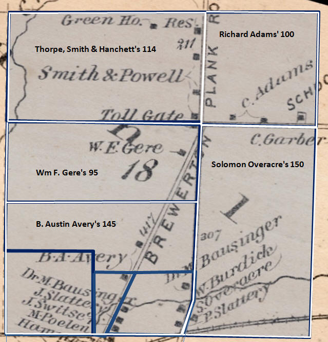 This 1874 map of Salina Lot #18 shows the various land holders at that time. Solomon Overacre's 150 acres was located in the south east corner of the lot. Most of the names found on the map match up with the names on the various parcels of land. The one exception is found in the northeast corner. Richard Adams had died in 1872. The "C. Adams" shown on the map was Claudius Adams, Richard's son. |