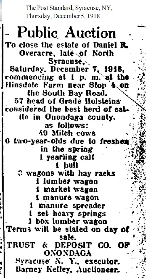 July 19, 1918 - Daniel R. Overacre and wife sold the Overacre farm to Arthur P. Crese (or Kresse) of Brookline, Norfolk County, MA (See Overacre Land Records) October 7, 1918 – Daniel Overacre died. November 25, 1918 - Fire destroyed 6 buildings on Overacre farm - $35,000 damage. [1918-11-25a], [1918-11-25b] December 7, 1918 – Public Auction to close the estate of Daniel R. Overacre – livestock and farm equipment. October 10, 1919 – Settlement Sought in Overacre Estate [1919-10-10].