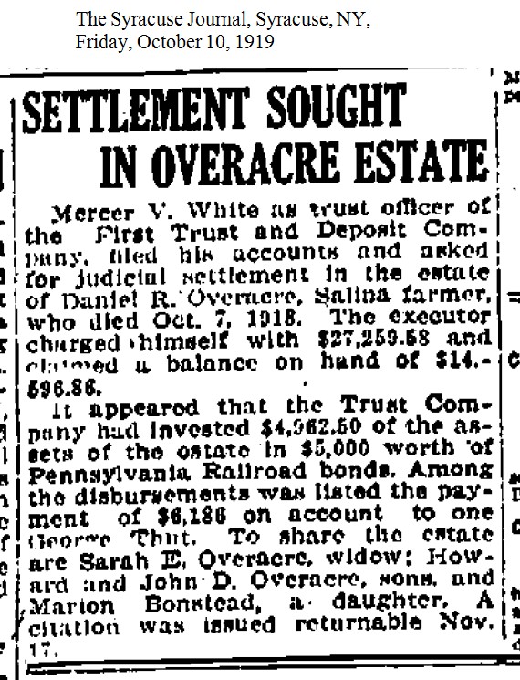 [1919-10-10] - "Settlement Sought in Overacre Estate," The Syracuse Journal, Syracuse, NY, Friday, October 10, 1919.