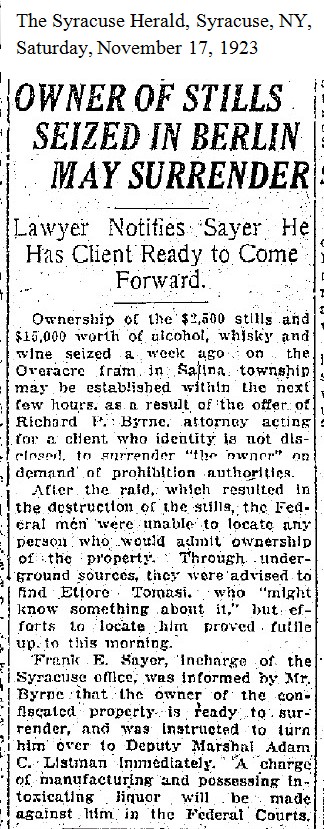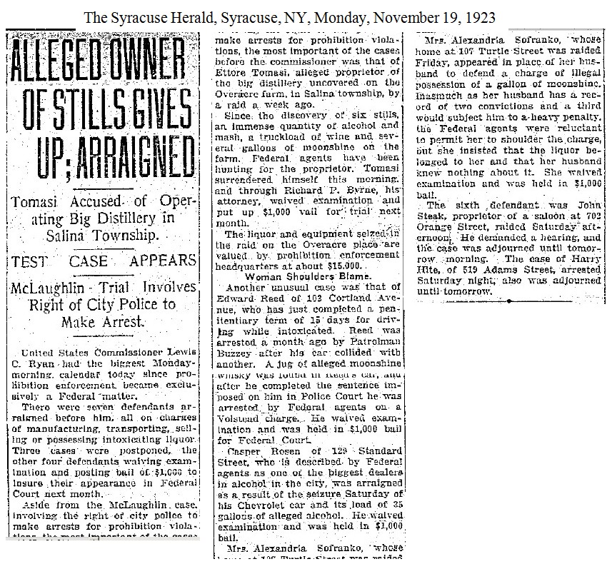 [1923-11-19] - "Alleged Owner of Stills Gives Up; Arraigned," The Syracuse Herald, Syracuse, NY, Monday, November 19, 1923.