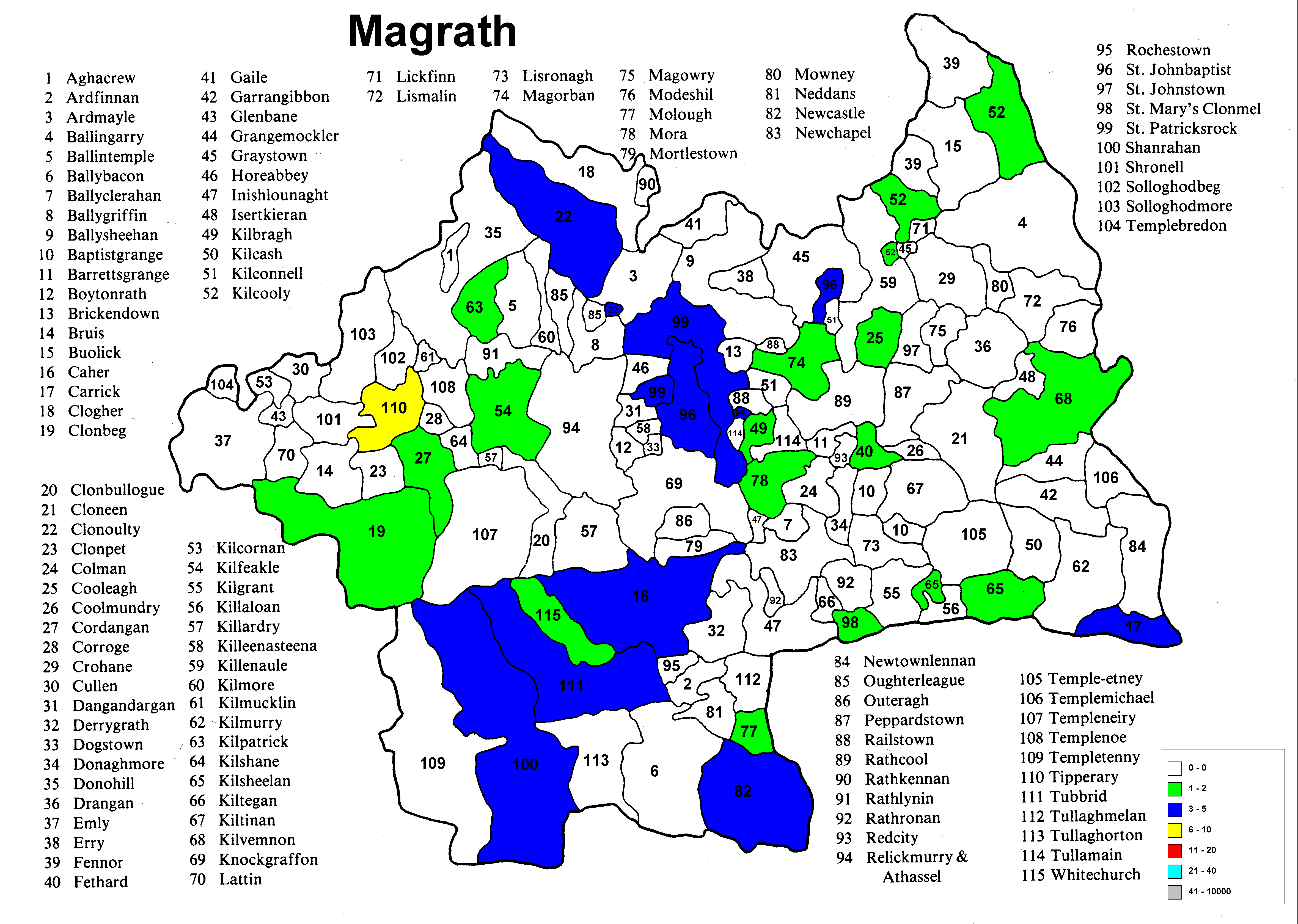 Irish geography presents special problems such as multipart counties (North & South Riding), multipart parishes (up to 5 in one county) and parish names that repeat in the different parts of the county. Everything has been sorted out except the multipart parishes in a given portion (Riding) of the county. The same count is applied to each portion because it wasn't possible to find a database that would allow the sorting of the townlands among the different parts of the parish