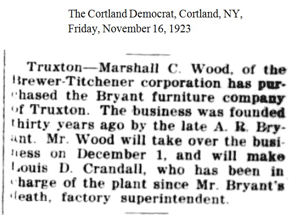 “Marshall C. Wood, of the Brewer-Titchener corporation has purchased the Bryant furniture company of Truxton. The business was founded thirty years ago by the late A. R. Bryant. Mr. Wood will take over the business on December 1, and will make Louis D. Crandall, who has been in charge of the plant since Mr. Bryant’s death, factory superintendent.” [1923-11-16]