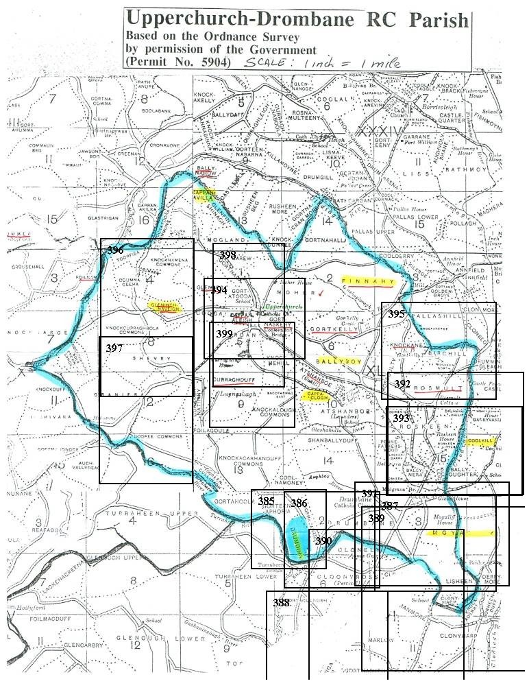 NOTE The map used for this guide is not a great map. Although it works as a guide to the more accurate maps it has several limitations: (1) it was pieced together from several maps; (2) the grid which should be square is rectangular which points to distortion from copying and scanning - therefore the scale "1 inch = 1 mile" is not to be taken seriously; (3) the border of the Upperchurch-Drombane RC boundary is not accurate. The Upperchurch-Drombane RC parish includes the civil parishes of Upperchurch, Templebeg and Moyaliff. There are townlands shown in the northwest and southeast sections that should be included within the boundary of the RC parish; (4) on the northwest and southeast borders of the maps there are townlands from the civil parishes of Upperchurch and Moyaliff that are missing from the map and these should also be included with the RC parish boundary.