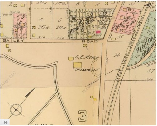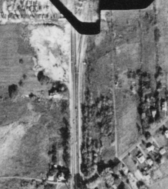 This section of an October 15, 1951 aerial photo shows the region near the Brewerton and South Bay Road split. The light colored area at the top of the photo, to the west of Brewerton Road, was the former location of Morey's Park. At the time of this photo it was filled with trailers and was called John's Trailer Park